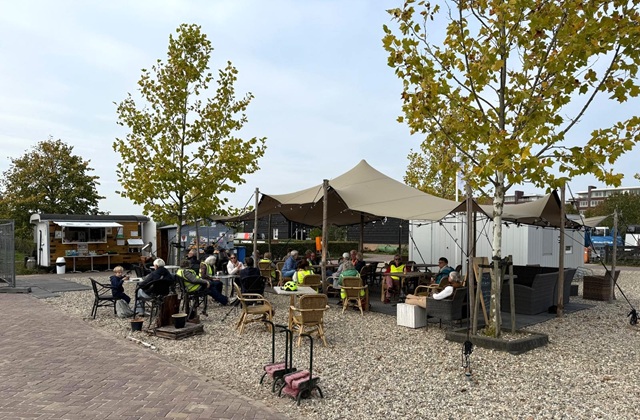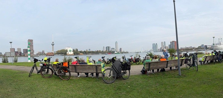 Even later, aan de oever van de Maas, met uitzicht op de Euromast en de mooie skyline van Rotterdam hebben we de lunch genuttigd. Een stukje door de wijk Charlois en door de bospaden van het Vrijenburgerbos en het Zuidelijk-randpark zijn we richting Barendrecht gereden om nog even te pauzeren bij De Kleine Duiker. Daar werden we getrakteerd op een stukje boterkoek. De verbouwing lijkt voorspoedig te verlopen, het dak ligt er al op. Volgend jaar kunnen we vast in het nieuwe gebouw van De Kleine Duiker onze koffie nuttigen.