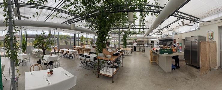 Het weer werkte mee en via de Pruimendijk en Rijksstraatweg naar het kassenrestaurant Clementine aan de achterkant van het Barendrechtse station. Je zou het hier niet zoeken maar dit restaurant staat vermeld in onze info voor de fietsleiders. Binnen bekleed met klimop en lekker licht en ruim. Nog even paniek omdat Marian haar fietscomputer miste. Weer even flink gezocht en Jannie zag het zowaar in het gras liggen, tot grote opluchting.