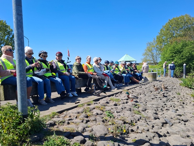 De koffiestop was geregeld met de vrijwilligers van het museum Twintighoeven in de Nieuwe Biesbosch. We konden binnen vrij rondkijken en in de tuin genieten van het zonnetje. Daarna volgden we de loop van de Nieuwe Merwede en kwamen via de Provinciale weg op het laatste stuk van de Zuidendijk in de richting van het Wantij. Tijd voor de boterham! Aan de oever van het Wantij was het even spannend of de bankjes niet bezet waren, maar we konden in een lange rij onze honger stillen, genieten van de natuur en voor een sanitaire stop mochten we gebruik maken van het toiletgebouw van de camping “Het Loze Vissertje”. Dank aan de gastvrije eigenaren!